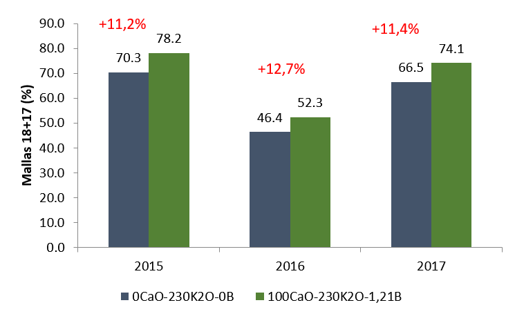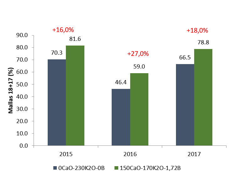 Figura 4b. Porcentaje de frutos AA o supremo para cada año de cosecha. Nótese la reducción en el tamaño del grano para el año 2016 debido a déficit hídrico durante el periodo de expansión del grano debido a condiciones de El Niño, que para la zona en donde se desarrolló la investigación significa reducción en las lluvias. Todos los tratamientos fueron fertilizados con las mismas dosis de nitrógeno, fósforo y magnesio. Las fuentes empleadas en el tratamiento de cero calcio y boro fueron Urea-DAP-KCL y Sulfato de Magnesio aplicadas por separado, mientras que los tratamientos con calcio y boro las fuentes empleadas fueron YaraMila, YaraLiva y YaraBela aplicadas por separado.