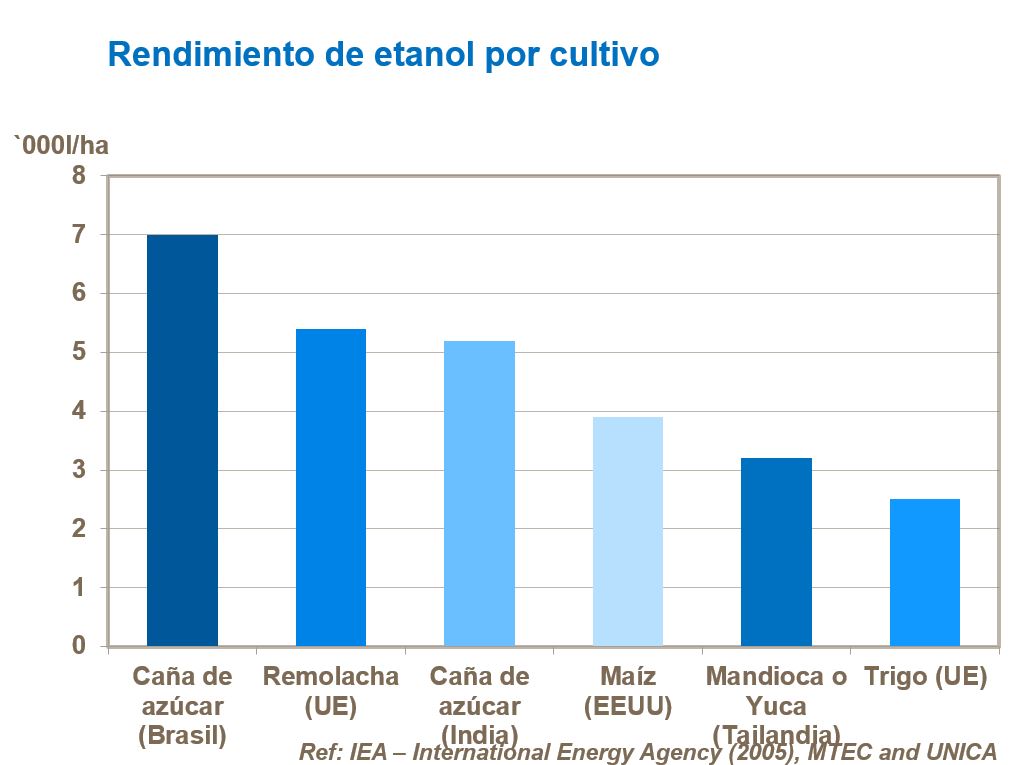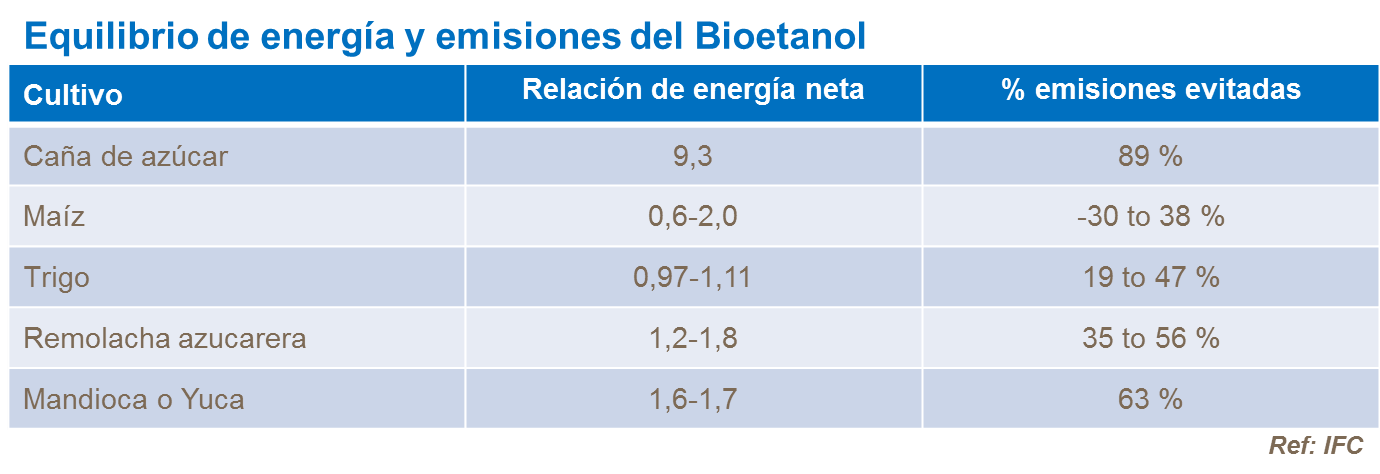 Comparado con el etanol derivado del maíz, trigo, remolacha azucarera o sorgo, el derivado de la caña tiene una relación de energía neta más elevada y un menor nivel de emisiones de CO2.