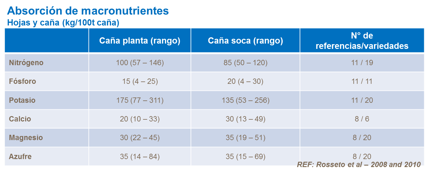 Las necesidades de nutrientes van a variar dependiendo del rendimiento esperado y del ciclo del cultivo. Las cañas planta en general absorben más nutrientes que los ciclos de cultivo sucesivos. Sin embargo, la caña planta se beneficia más de la mineralización de N y por lo tanto para alcanzar el mismo rendimiento, la demanda de fertilizante N es mayor para un cultivo sucesivo que para una caña planta.