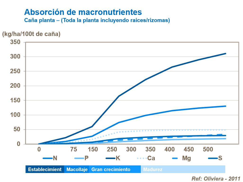 En la etapa temprana del ciclo de vida del cultivo se absorbe una cantidad significativa de calcio, lo que juega un papel importante en el enraizamiento y en la integridad de las células de la planta. En comparación, el azufre y el magnesio se absorben más lentamente y en estadios de crecimiento posteriores, ambos son importantes para la calidad del azúcar y las proporciones son mayores en el tallo de la planta que en otras partes. Los suministros de azufre y magnesio deben mantenerse para que el cultivo genere un rendimiento alto de azúcar.