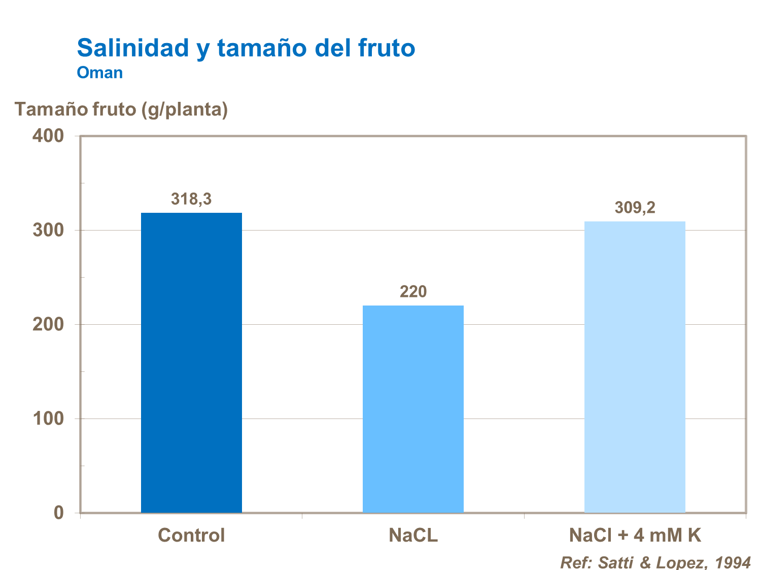 - Reducción en el tamaño del fruto (tabla Salinidad y tamaño del fruto). Agregando potasio se corregirán los síntomas.