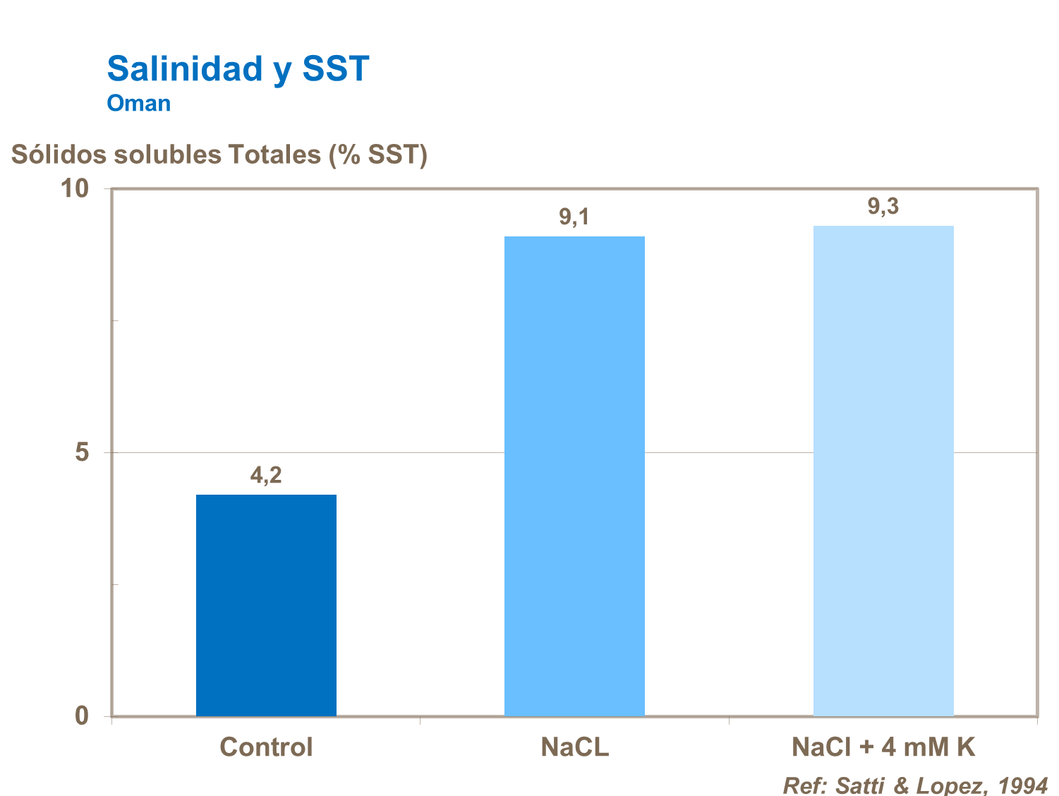 - Aumento en azúcares (tabla Salinidad y SST) igual que el contenido de ácidos en el fruto mejorando el sabor.